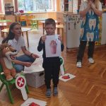 Bērni Zobiņu skolā šķiroja zobiņiem labvēlīgos un ne tik labos produktus (našķus).